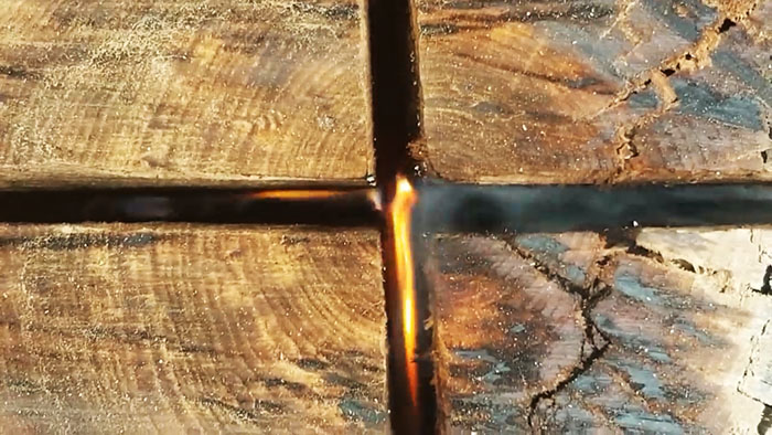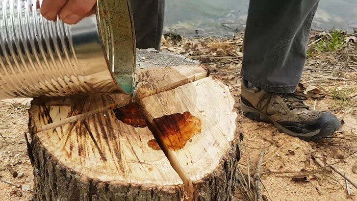 Заливаем в щели керосин, примерно 100 миллилитров. Он имеет большее время сгорание по сравнению с бензином. Если керосина нет, можно попробовать смешать бензин с минеральным маслом в пропорции 1 к 1, эта смесь будет гореть намного дольше. Так же отлично подойдет жидкость для розжига углей для мангала.