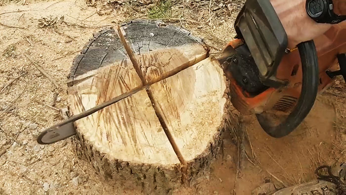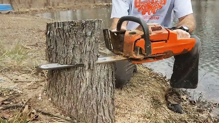 Срезаем верхню часть пня бензопилой, тем самым выравнивания поверхность.
