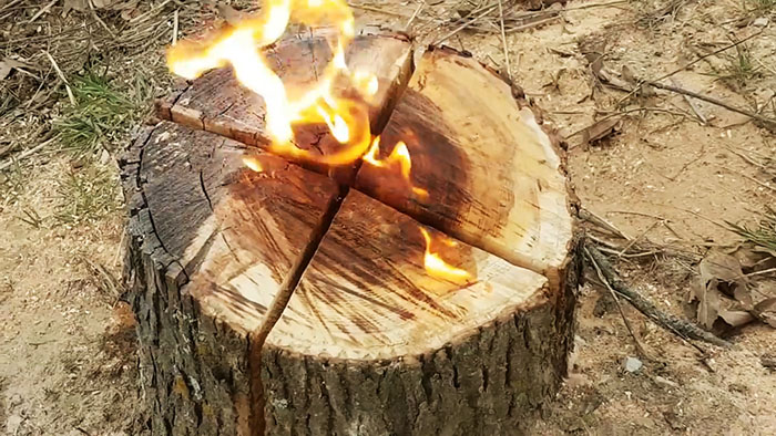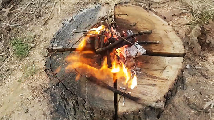 Если пень сухой, то этих действий должно хватить, а если нет, придется развести костер сверху. Для этого кладем сверху сухой хворост.