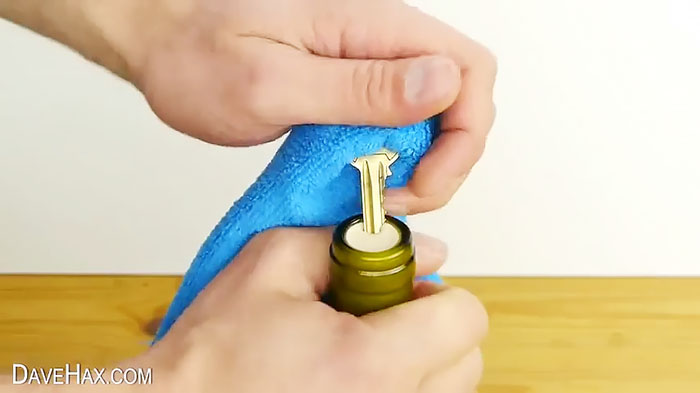 Вставляем ключ под углом в пробку и продавливаем наискосок. Если будет тяжело давить, подложите любую ткань.