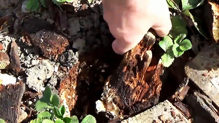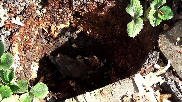 Примерно через год пенек можно выворачивать. От него отвалится кора, древесина станет мягкой и податливой, внутри образуется древесная труха.