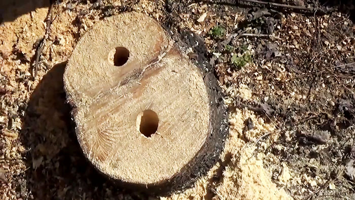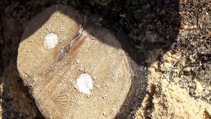 Перьевым сверлом сделайте в пеньке несколько отверстий диаметром 25 мм. Количество зависит от диметра дерева, расстояние между ними примерно 10 см. Глубину сверлите максимальной. Чем больше войдет селитры и чем она глубже проникнет – тем заметнее эффект. Очистите поверхность пенька от стружки, достаньте все опилки из отверстий.
