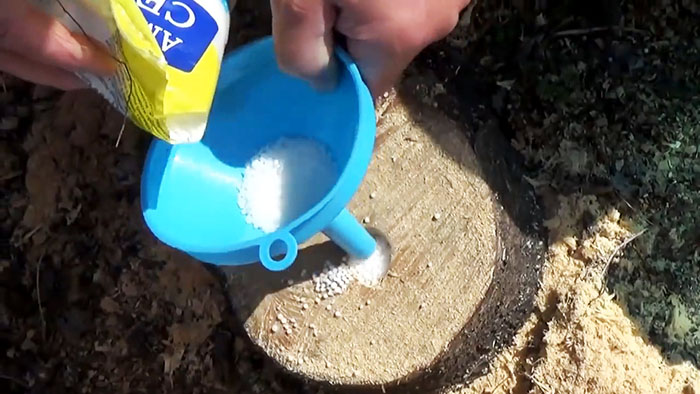 При помощи большой воронки наполните селитрой подготовленные отверстия. Если воронки под руками нет, то можно аккуратно насыпать прямо из пакета.