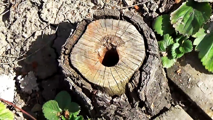 Пальцем или палочкой утрамбуйте и опять досыпьте удобрение. В таком состоянии оставьте пенек минимум на шесть месяцев. Если на участок могут заходить куры, то обязательно накройте пенек. Птицы клюют гранулы селитры и получают сильные ожоги пищеварительного тракта.