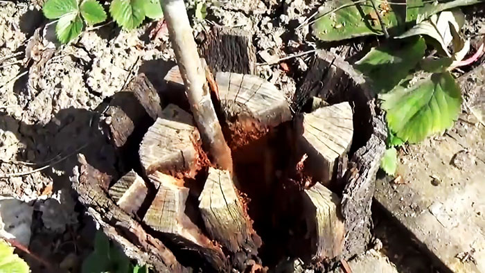 В отверстие вставьте ломик, надавливайте на него в разные стороны. Пенек без проблем разламывается на небольшие кусочки.