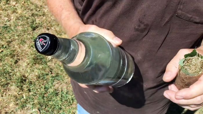 Берем бутылку (кстати пластиковая тоже годится) и заполняем ее чистой водой. Затем как линзой лупу ловим солнечный свет, пытаясь сфокусировать концентрированную световую точку на сухой траве. Это нужно делать в районе горлышка, так как оно имеет округлую форму.