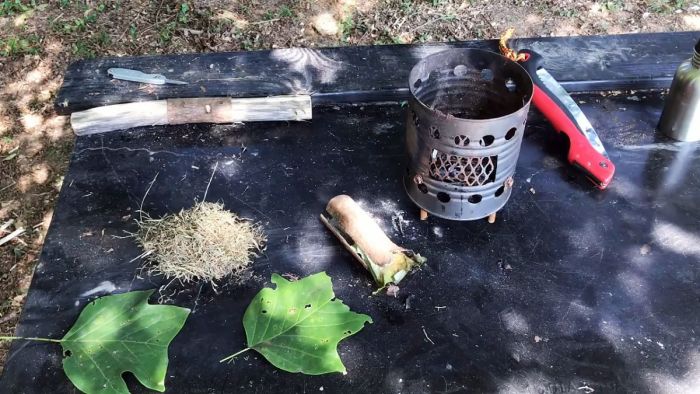 Далее нам понадобится сухая трава и зеленый лист с дерева.