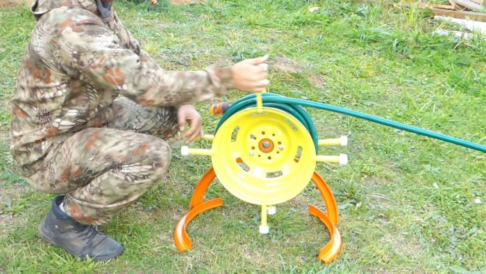 Катушка полностью готова к работе. Проверяем ее в деле: закрепляем конец шланга на диске и начинаем его вращать за прутки-ручки, которые одновременно будут служить ограничителями для шланга.