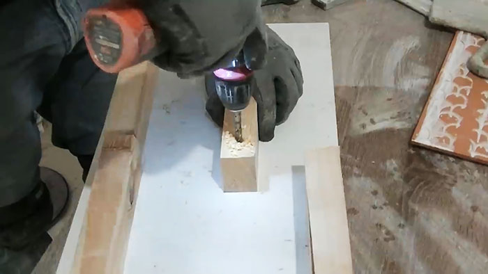 Далее необходимо закрепить отрезки на плите ДСП. Чтобы это сделать саморезами, просверлим 2/3 длины бруска сверлом, диаметр которого превышает диаметр шляпки самореза.