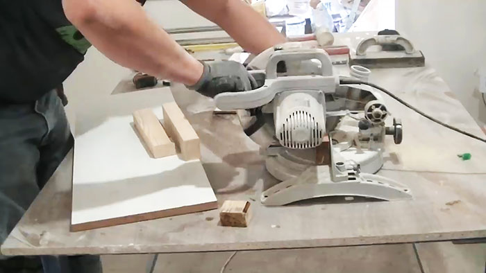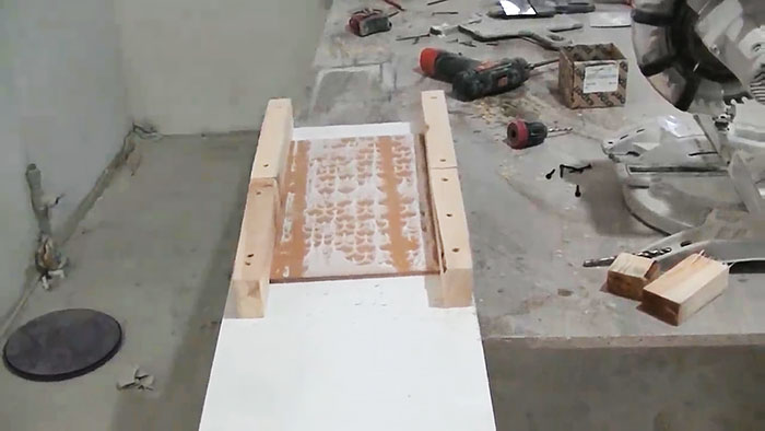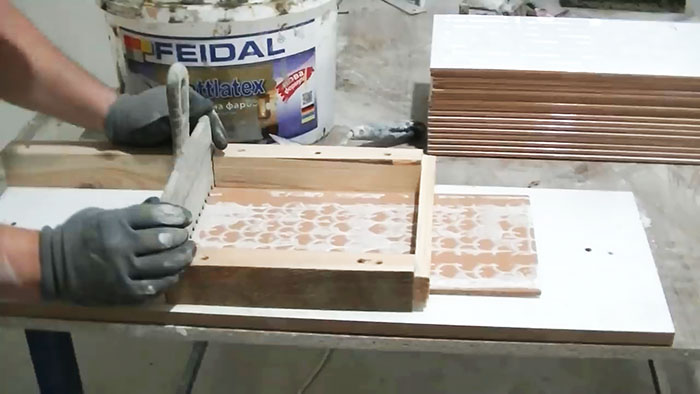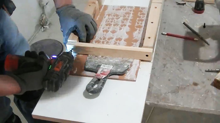 Теперь кладем плитку на лист ДСП, а по бокам сначала привинчиваем по два бруска.