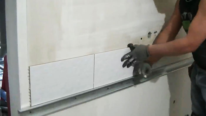 Устанавливаем зубчатый шпатель для нанесения клея на плитку, в промежутки между стыковкой реек.
