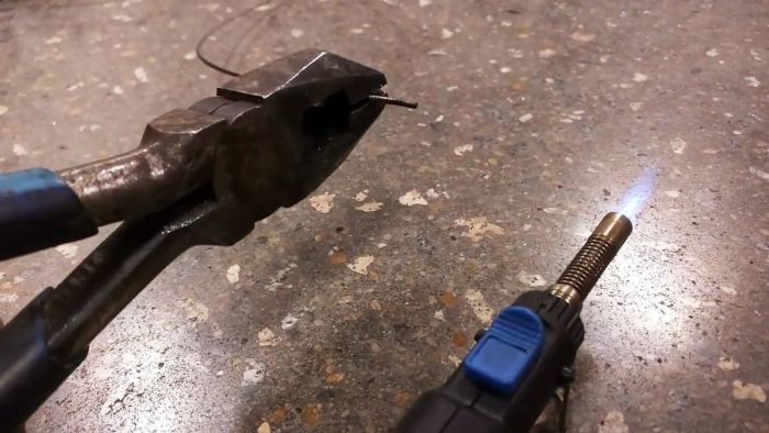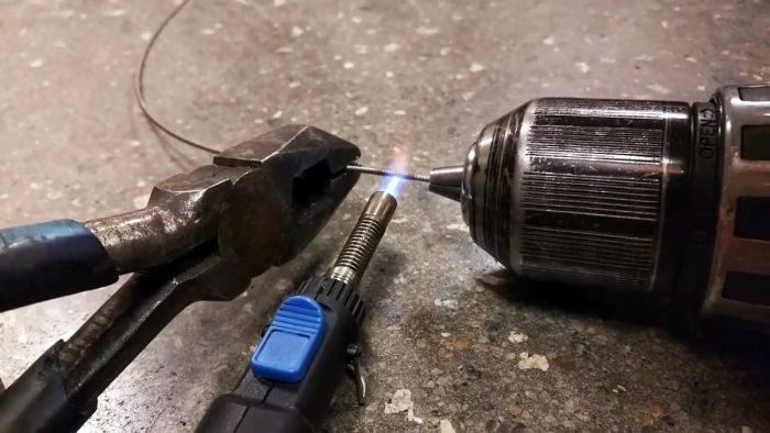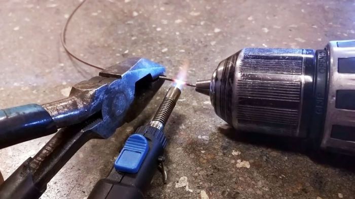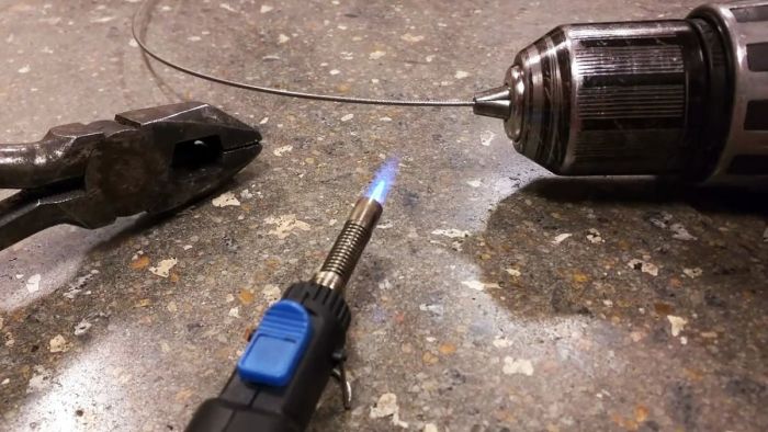 Зажимаем конец троса в патрон шуруповерта. На некотором расстоянии удерживаем трос плоскогубцами. А середину между ними нагреваем газовой горелкой.