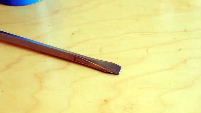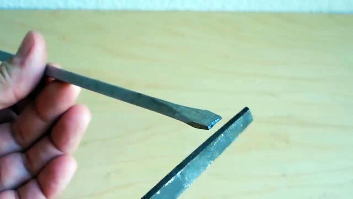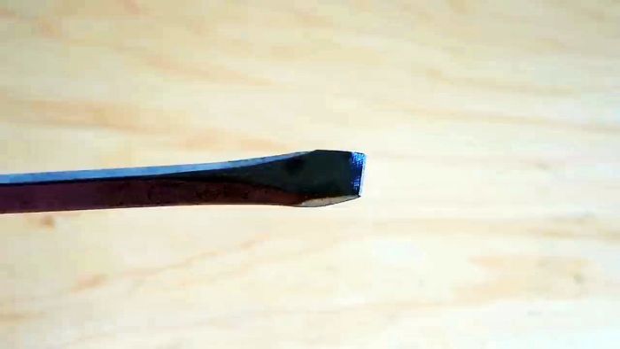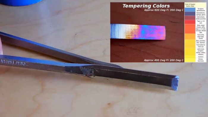 Проделаем то же самое с тупой стамеской, начав с заточки напильником, а потом закаляем, когда конец станет фиолетовым. Прогреваем осторожно, чтобы не перекалить острие.