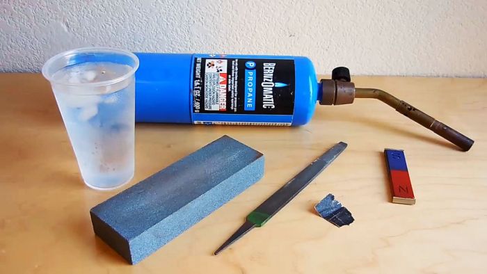 Газовой горелкой нагреваем конец отвертки с заново сформированным жалом. Видно, как при нагревании изменяется его цвет, что важно для закалки. Также проверим готовность инструмента к закалке магнитом. Он перестает притягиваться к металлу, когда температура достигает 760 градусов Цельсия, и его нужно быстро охлаждать.