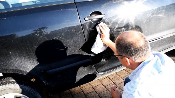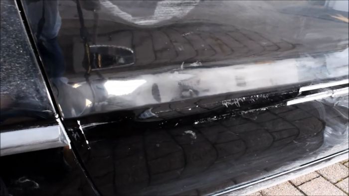 Промываем чистой водой и насухо протираем вмятину и металл вокруг нее. При необходимости используем моющие средства. Также удаляем следы клея под молдингом.