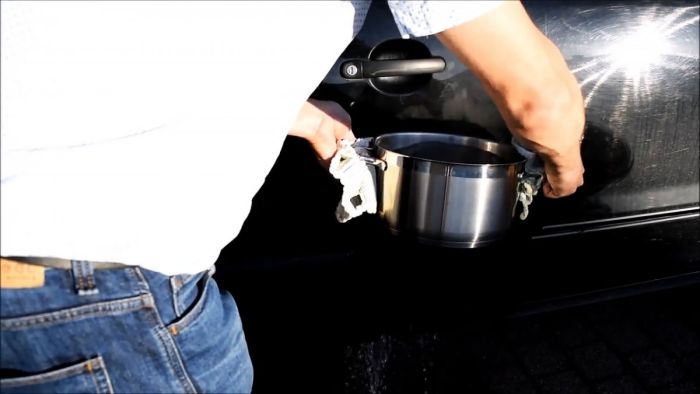 В зависимости от величины вмятины кипятим в емкости соответствующий объем воды поливаем ей поврежденное место и область вокруг него.