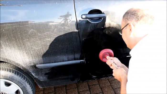 Если глубина повреждения небольшая, то возможно исправление одной установкой вантуза и резким его отрывом. Чаще всего, и особенно в случае вмятины с переменной глубиной и сложным очертанием, процедуру установки и отрыва вантуза придется повторять многократно.