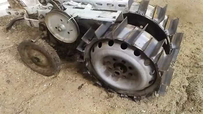 В результате получаются достаточно узкие облегченные колеса. Если их не обрезать, то грунтозацепы окажутся слишком высокими, поэтому недостаточно широкие мотоблоки потеряют в устойчивости, так как центр тяжести сильно сместится вверх.