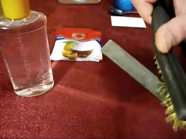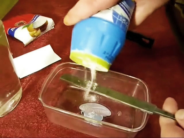 Также до травления напильник обезжириваем. Для этого помещаем его над удлиненной кюветой, посыпаем щелочным чистящим средством, например, стиральным порошком, и смоченной в воде, зубной щеткой удаляем остатки грязи, жира и масел.