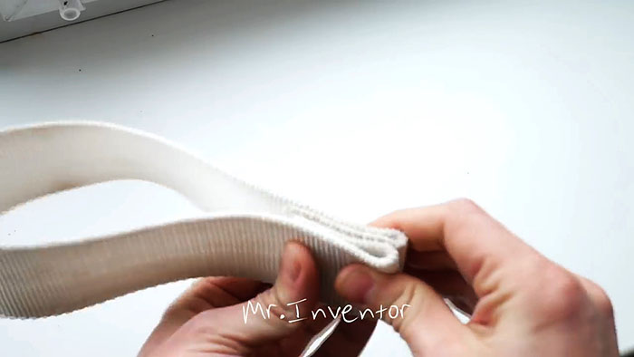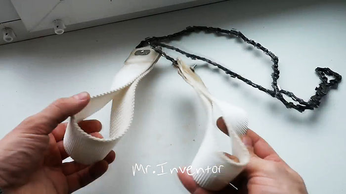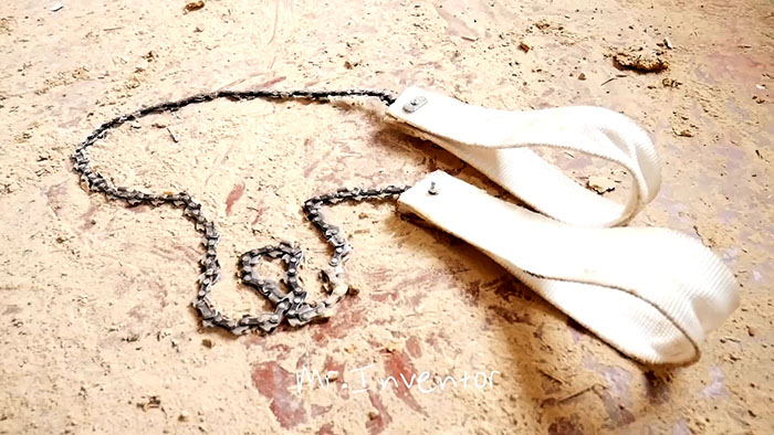 Пила изготавливается из цепи от бензопилы, для ручек использован отрезок полимерной стропы длиной 60–70 см и шириной примерно 3–4 см. Элементы крепятся болтиками М 6 с шайбами и гайками. Пластик склеивается утюгом через бумагу для выпечки, цепь разбирается при помощи небольшой болгарки и пробойника.