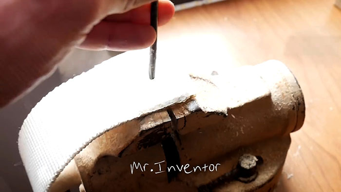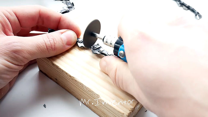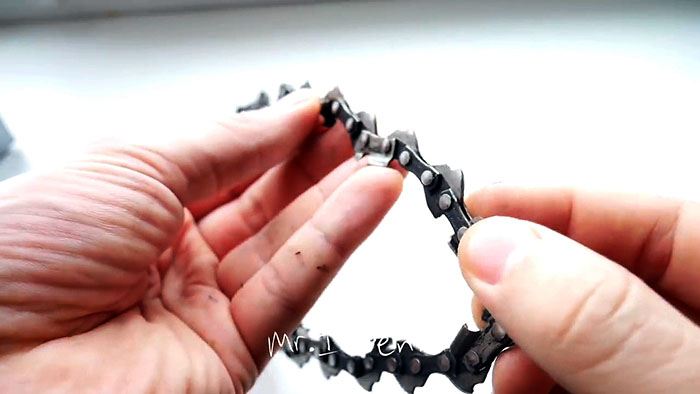 Положите цепь на ровную площадку, найдите соединительное звено. Аккумуляторной угловой шлифмашиной или болгаркой аккуратно спилите шляпку заклепок, соединяющих звенья цепи.