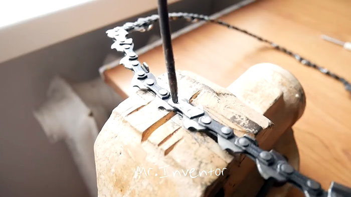 Положите цепь на тиски и пробоем удалите оси соединительных заклепок, цепь разъединится.