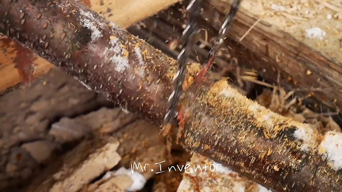 Амплитуда движений небольшая, для ручной работы достаточно длины цепи 30–40 см, ручку можно сделать из прочной веревки. Такая пила компактнее, занимает меньше места, а скорость резания одинакова. Заводской длины цепи хватает на два приспособления.
