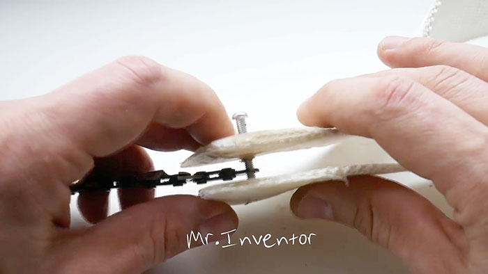 Присоедините к ручкам цепь. Вначале ставьте в отверстие болтик с шайбой, наденьте на него открытое звено цепи, затем второй конец ручки и затяните соединение гайкой.