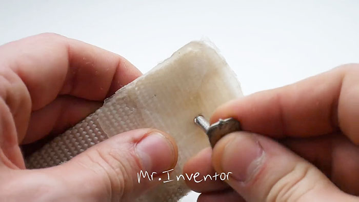 При помощи пробойника сделайте отверстия под болтики. Располагать их надо примерно посередине подготовленного места на расстоянии 2–3 см от торца.