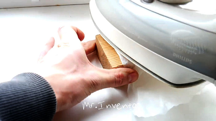 На отрезок доски положите кусок бумаги для выпечки, на него один конец подогнутой стропы, сверху опять бумагу. Утюгом нагревайте подготовленное место до тех пор, пока полимер не расплавится и не склеится. Грейте осторожно, не допускайте полного расплавления пластика – некоторые виды становятся хрупкими, во время работы пилой место фиксации цепи трескается, инструмент придется ремонтировать в полевых условиях. По такой технологии обработайте все четыре конца кусков ленты.