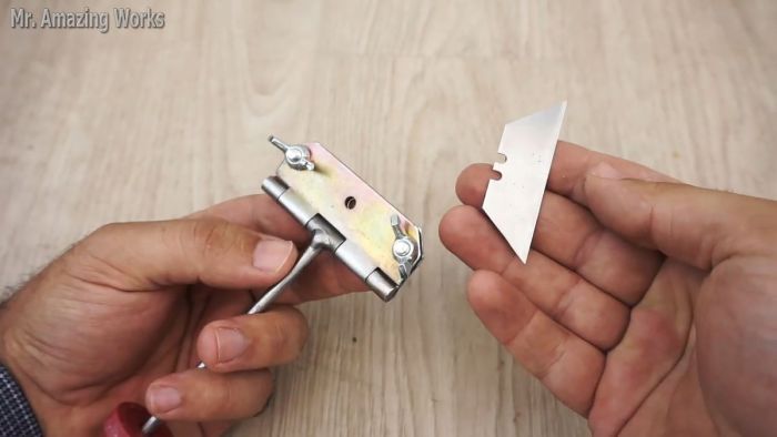 Слегка отпустив барашковые гайки, в зазор между крыльями петли вставляем сменное лезвие для строительного ножа, и вновь затягиваем резьбовые пары. Наш самодельный скребок полностью готов к работе по прямому назначению.
