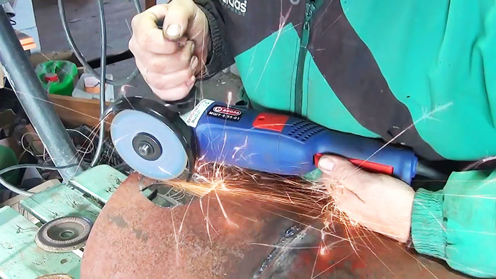 Теперь нужно удалить оставшуюся часть металла между контуром круглого отверстия и границей вырезанного в нем квадрата. Для этого болгаркой лишняя сталь распускается на сектора шириной в 1-1,5 см. Если металл толстый, то делая надрезы лучше соблюдать малый шаг.