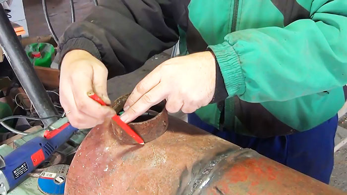 Он имеет малый диаметр, поэтому при резке касается металла меньшей площадью. С его помощью нужно прорезать небольшое углубление по контуру отверстия. Достаточно углубиться буквально на 1/3 от толщины стали. Поскольку стертый отрезной диск имеет маленький диаметр, то врезка получится ровной, без образования засечек за пределами окружности.