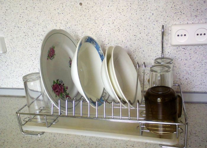 Я давно смотрела на свою сушилку для посуды. Она металлическая, куплена в магазине эконом-класса. Качество соответствующее. Так как сушилка постоянно контактирует с влагой, то через некоторое время наш предмет интерьера покрылся неприятным рыжим налётом. Пробовала отмывать водой и мочалкой, а что толку: налёт только увеличивался и появилась рыхлая ржавчина. На снимке только фрагмент решётки, для того чтобы можно было ближе рассмотреть, как это выглядело.