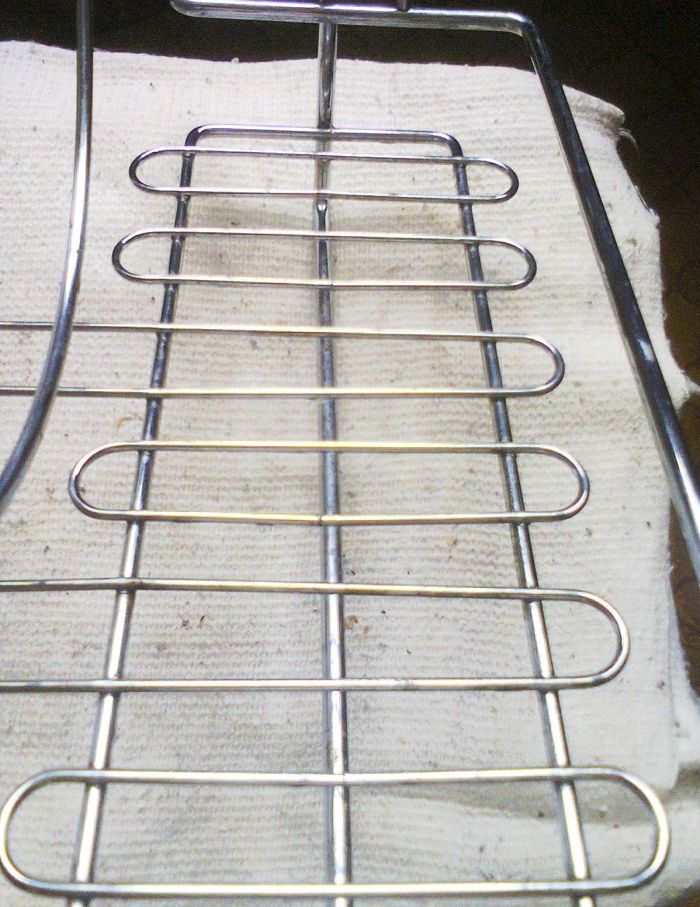 Прошло 12 часов. После того, как достала сушилку из таза, сильно расстроилась: вся ржавчина была на месте. От расстройства взяла губку и средство для мытья посуды. Каково же было моё удивление, когда всё очень легко отмылось, только на стыке прутиков пришлось немножко почистить старой зубной щёткой. Процедура заняла пятнадцать минут (не более). Посудите сами, как здорово получилось. Конечно, если внимательно присмотреться, можно увидеть редкие мелкие чёрные точки в тех местах, где была рыхлая коррозия. Возможно, стоит поискать ещё какое-то эффективное средство.
