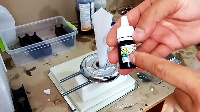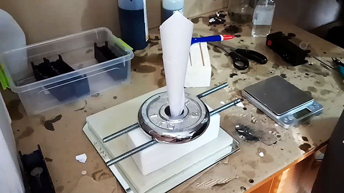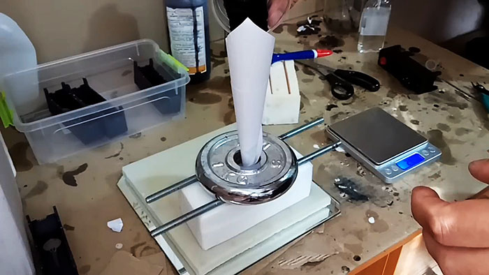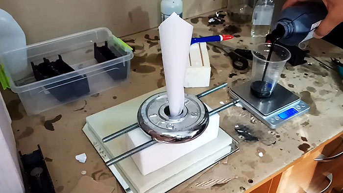 Сверху силиконовую форму придавливаем рассредоточенным грузом (гнетом) весом до одного килограмма. Чтобы заливка литьевого материала протекала аккуратно и быстро, выполняем бумажную воронку. После чего, можно считать, форма подготовлена к литью.
