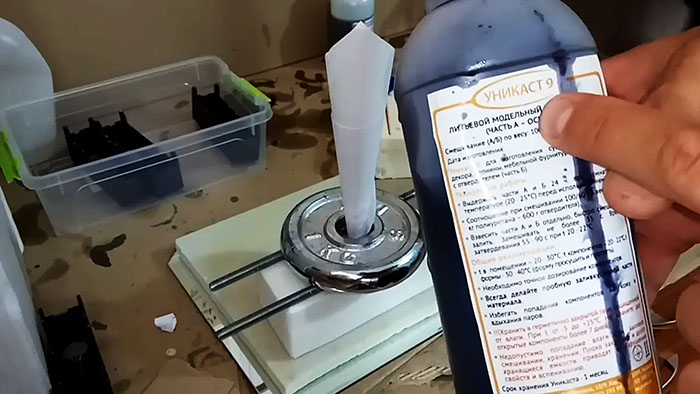 Для заливки берем наиболее дешевый литьевой полиуретан «УНИКАСТ 9» (часть А) и затвердитель (часть Б), которые смешиваем в пропорции 1:0,6.