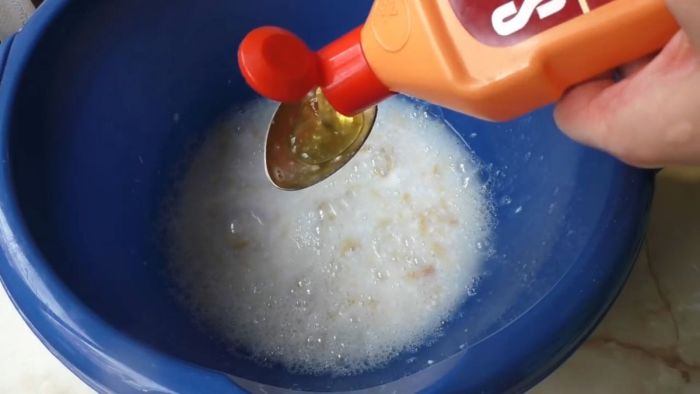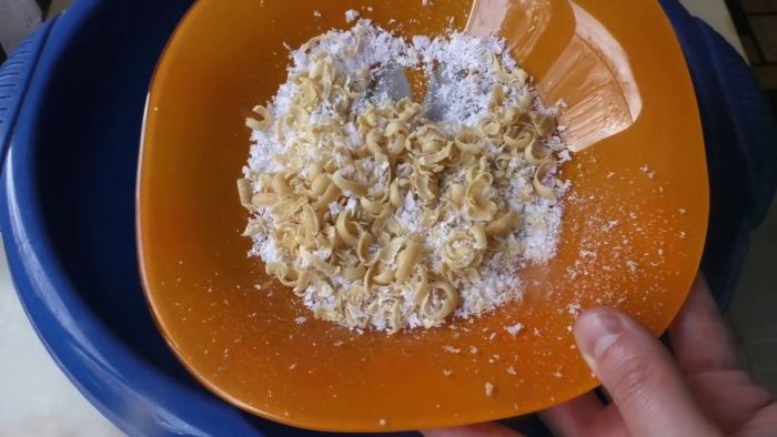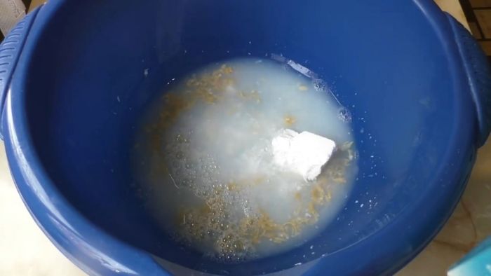 Налейте в таз 300–500 мл горячей воды. Всыпьте в нее немного натертого на крупной терке хозяйственного мыла (примерно 30–50 гр.).