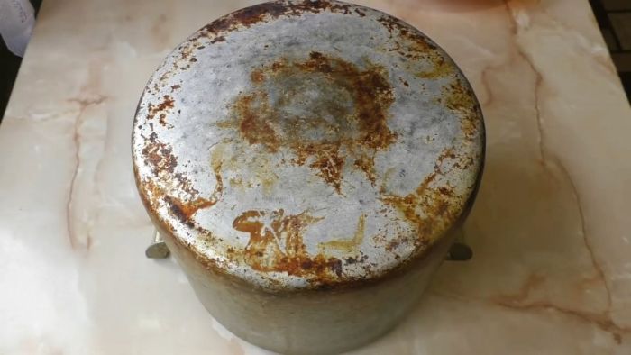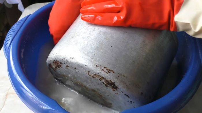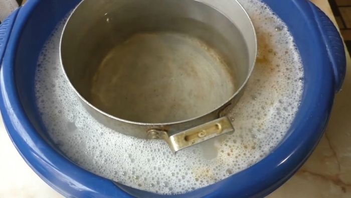 Заполните кастрюлю кипятком и опустите ее в таз. Если поверхность не полностью покрылась раствором, то долейте в него воду. В таком положении оставьте кастрюлю на 5–6 часов, при возможности пусть она мокнет всю ночь.