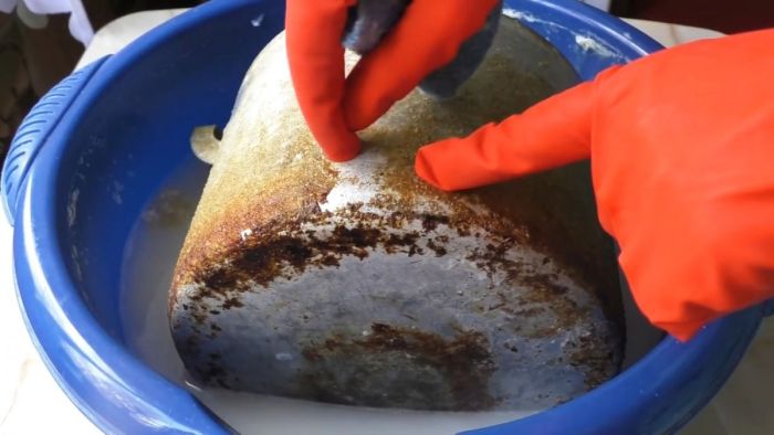 Пробуйте самые грязные и места, старый нагар смывается труднее всего. Обязательно работайте в резиновых перчатках, приготовленный раствор очень сильно разъедает кожу.