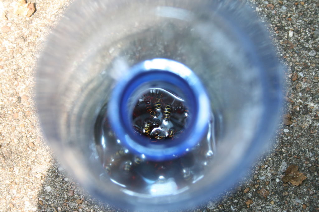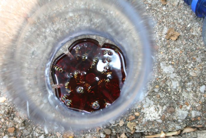 5. По мере заполнения ловушки погибшими осами, их необходимо оттуда удалять, приспособление промывать, дезинфицировать и, вновь заправив, расставлять в тех местах, где появляются осы. Тельца мертвых насекомых следует утилизировать, например, закапывать в землю, иначе их запах будет привлекать все новых ос из ближайшей к дому округе.