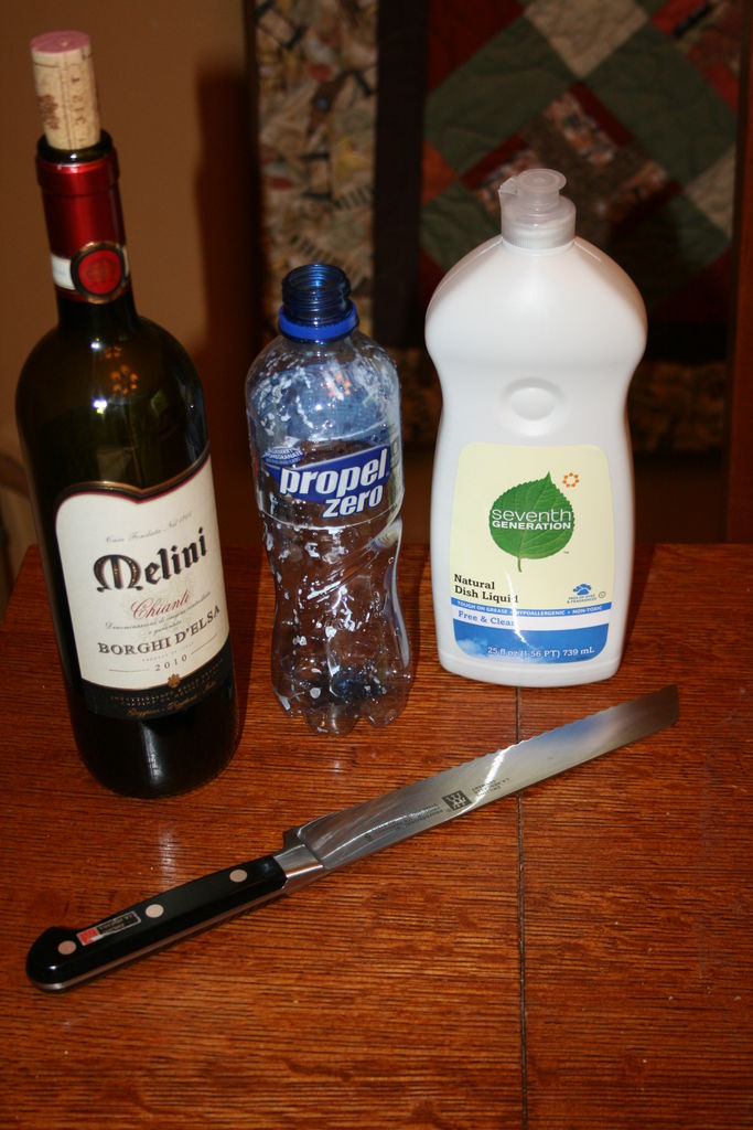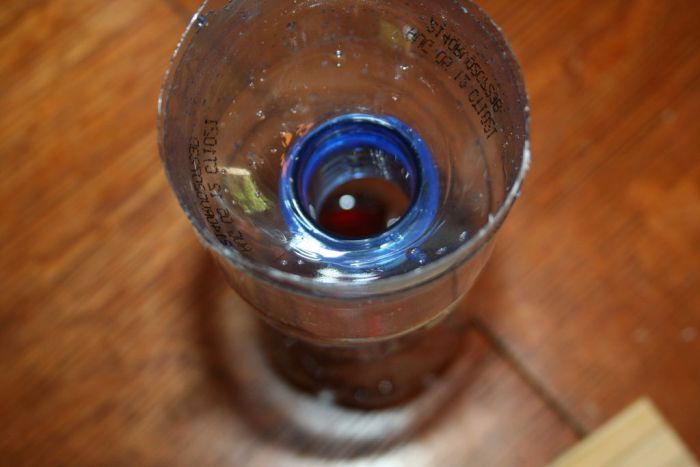 2. В большую часть бутылки наливаем красное вино примерно до уровня 15 мм от дна и добавляем еще две-три капли жидкости для мытья посуды, чтобы усилить запах приманки.