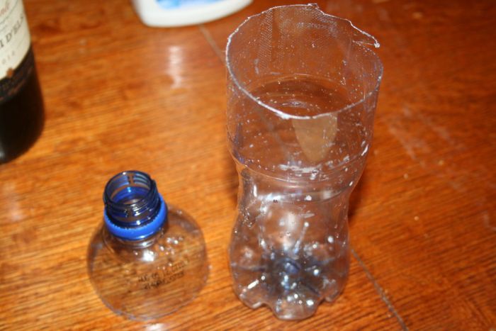 1. Острым ножом или ножницами отрезаем верхнюю часть пластиковой бутылки по кругу в том месте, где она начинает переходить в цилиндрическую форму (примерно 1/3 емкости по высоте).