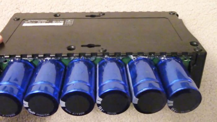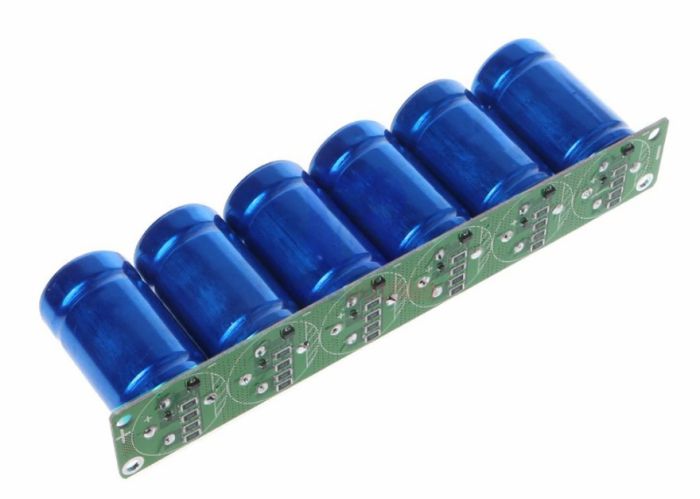 Емкость 1 элемента в цепи 500 Фарад и напряжение 2,7 В. То есть 6 штук составят батарею, которую можно зарядить максимум до 16,2 В.