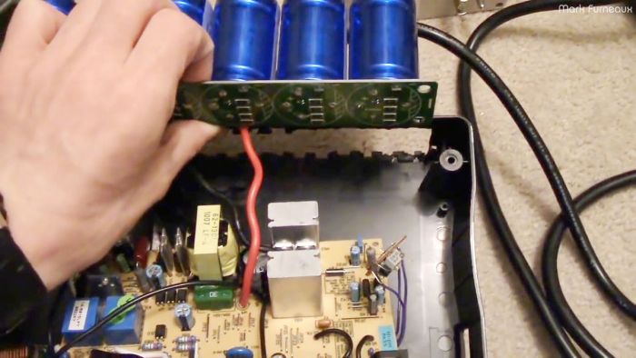 В данном примере использовался ИБП, который имел максимальную мощность нагрузки 300 Вт. В нем была удалена нерабочая батарея и установлена плата с суперконденсаторами вместо АКБ.