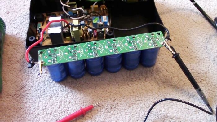 Первый запуск. И тут же первая неудача: ИБП конечно же включился, но заряжать ионисторы отказался. Почему? Дело в том, что в схеме ИБП имелась защита, которая не давала зарядку если начальное напряжение АКБ меньше 10 В.