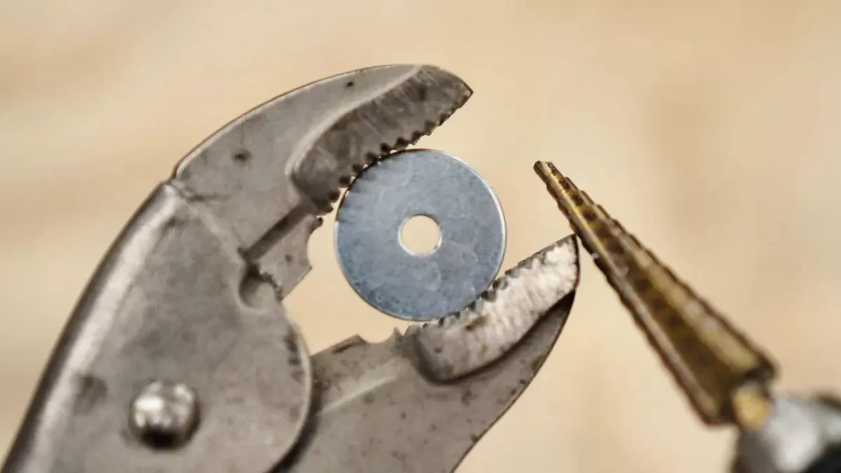В самом крайнем случае можно воспользоваться обычными плоскогубцами и деревянной подложкой, надежно зафиксированной на верстаке (или в любом другом месте). Погружая сверло в более податливое дерево, мы обеспечиваем фиксацию местоположения шуруповерта и шайбы. Удерживая последнюю за край плоскогубцами, предотвращаем ее прокручивание.