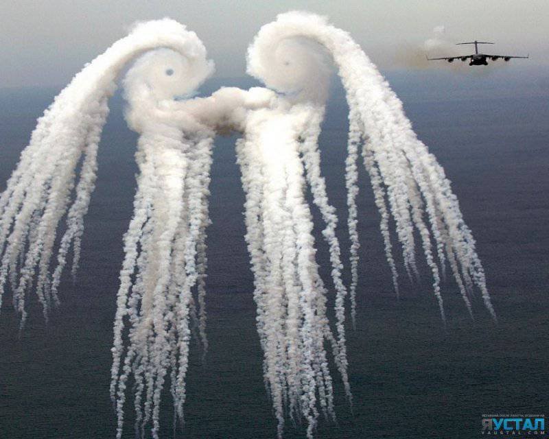Самолеты C-17 Globemaster III над Атлантическим океаном. В результате выхлопа огня и дыма получились такие завихрения.