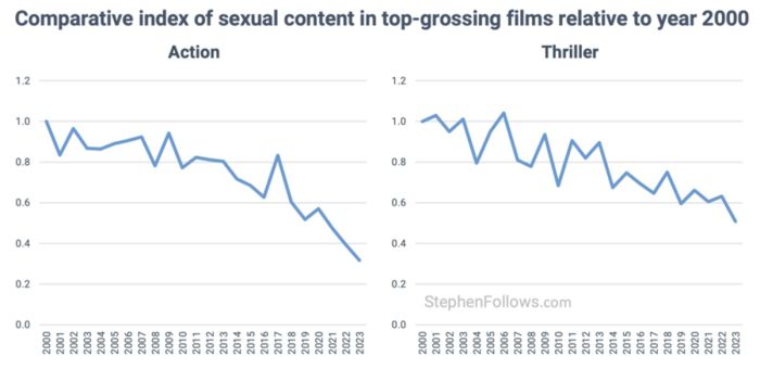 Причем с 2000 по 2023 год снизилось как общее количество сексуальных сцен на экране, так и, собственно говоря, самих фильмов, содержащих такие сцены. С течением времени кинематографисты стали использовать все меньше и меньше телесного контакта.