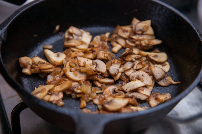 Обжарить грибы с луком на довольно сильном огне до тех пор, пока грибы не подрумянятся. Посолить и поперчить.